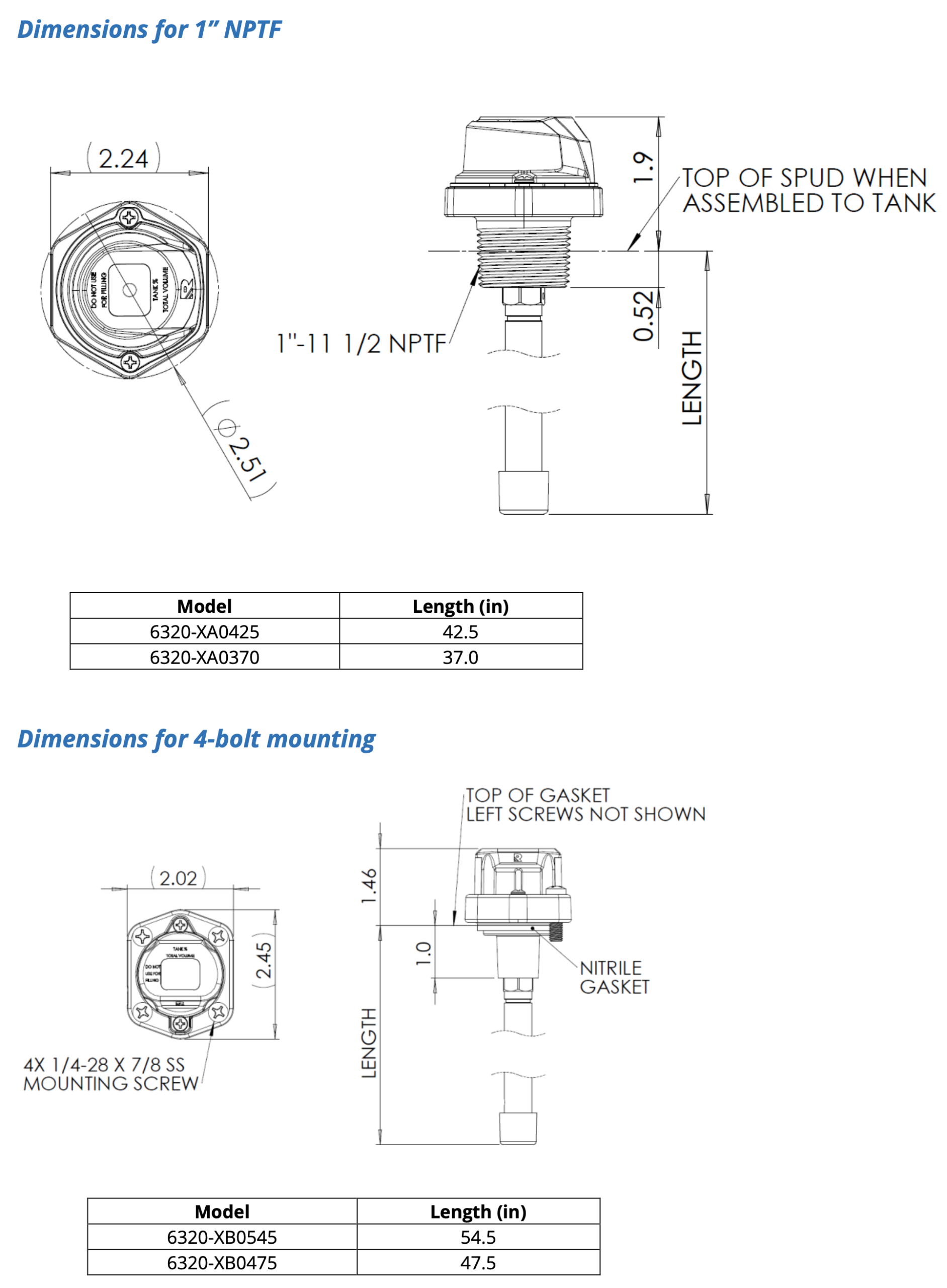 - 1” NPTF threaded connection to tank standard. Contact your local Rochester Sensors sales team for additional mounting options.